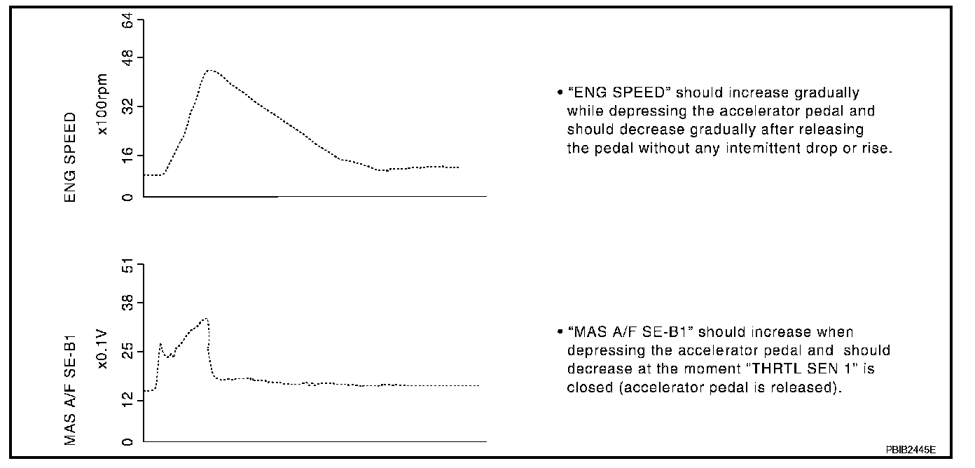 Above is the data for "ENG SPEED", "MAS A/F SE-B1", "THRTL SEN 1", "HO2S2 (B1)" and "INJ PULSE-B1" when revving engine quickly up to 4,800 rpm under no load after warming up engine sufficiently.