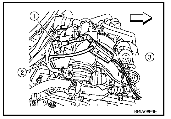 2. Connect ignition coil NO. 1 (1) and spark plug with suitable high-tension wire (2) as shown, and attach timing light (3) clamp to this wire.