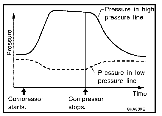 Refrigerant leaks should be checked immediately after stopping the engine. Begin with the leak detector at the compressor. The pressure on the high pressure side will gradually drop after refrigerant circulation stops and pressure on the low pressure side will gradually rise, as shown in the graph. Some leaks are more easily detected when pressure is high.