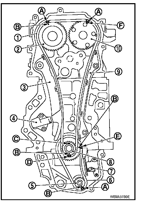 Timing Component Alignment MarksNOTE: The figure shows the relationship between the matching mark on each timing chain and that on the corresponding sprocket, with the components installed.