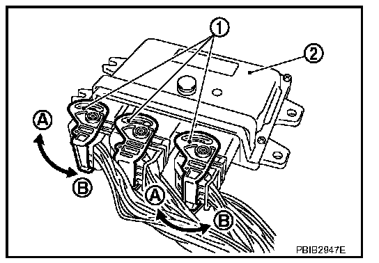 - When connecting ECM harness connector, fasten (B) it securely with a lever (1) as far as it will go as shown in the figure.