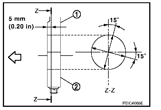 ^ Measure the position shown [5 mm (0.20 in)] backward from main bearing housing front side in the 2 directions as shown. The smaller one is the measured value.