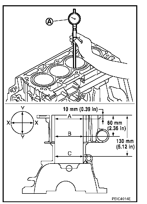 ^ Using a bore gauge (A), measure the cylinder bore for wear, out-of-round and taper at six different points on each cylinder. ("X" and "Y" directions at "A", "B" and "C") ("Y" is in longitudinal direction of engine)