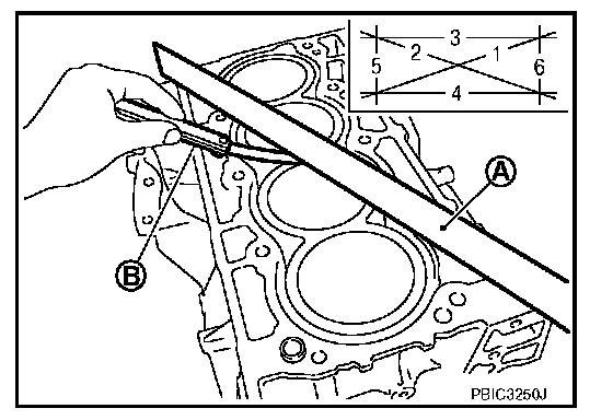 ^ Measure the distortion on the cylinder block upper face at some different points in six directions with a straight edge (A) and feeler gauge (B).