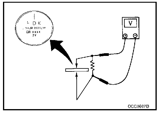 INTELLIGENT KEY BATTERY INSPECTION1. Remove battery to measure voltage across battery positive (+) and negative (-) terminals.