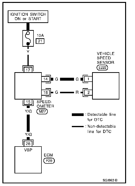 - A line with regular weight (wider line) represents a "detectable line for DTC (Diagnostic Trouble Code)". A "detectable line for DTC" is a circuit in which ECM can detect its malfunctions with the on board diagnostic system.