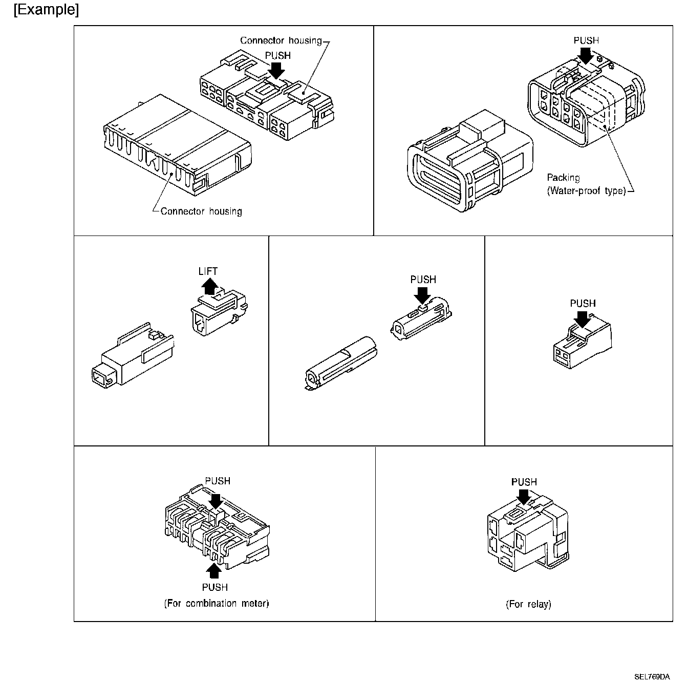 - The tab-locking type connectors are disconnected by pushing or lifting the locking tab(s). Refer to the illustration.
