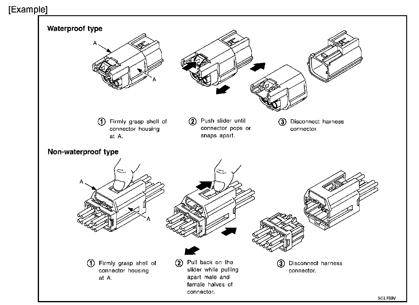 - Do not pull the harness or wires when disconnecting the connector.