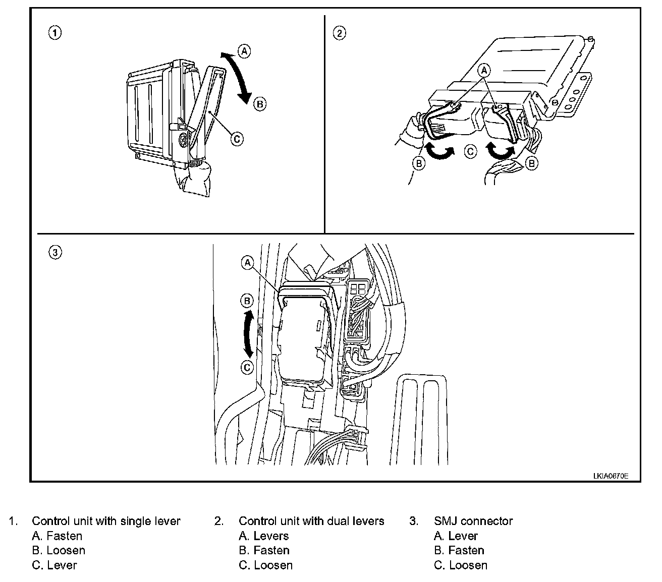 - Lever locking type harness connectors are used on certain control units and control modules such as ECM ABS actuator and electric unit (control unit) etc.