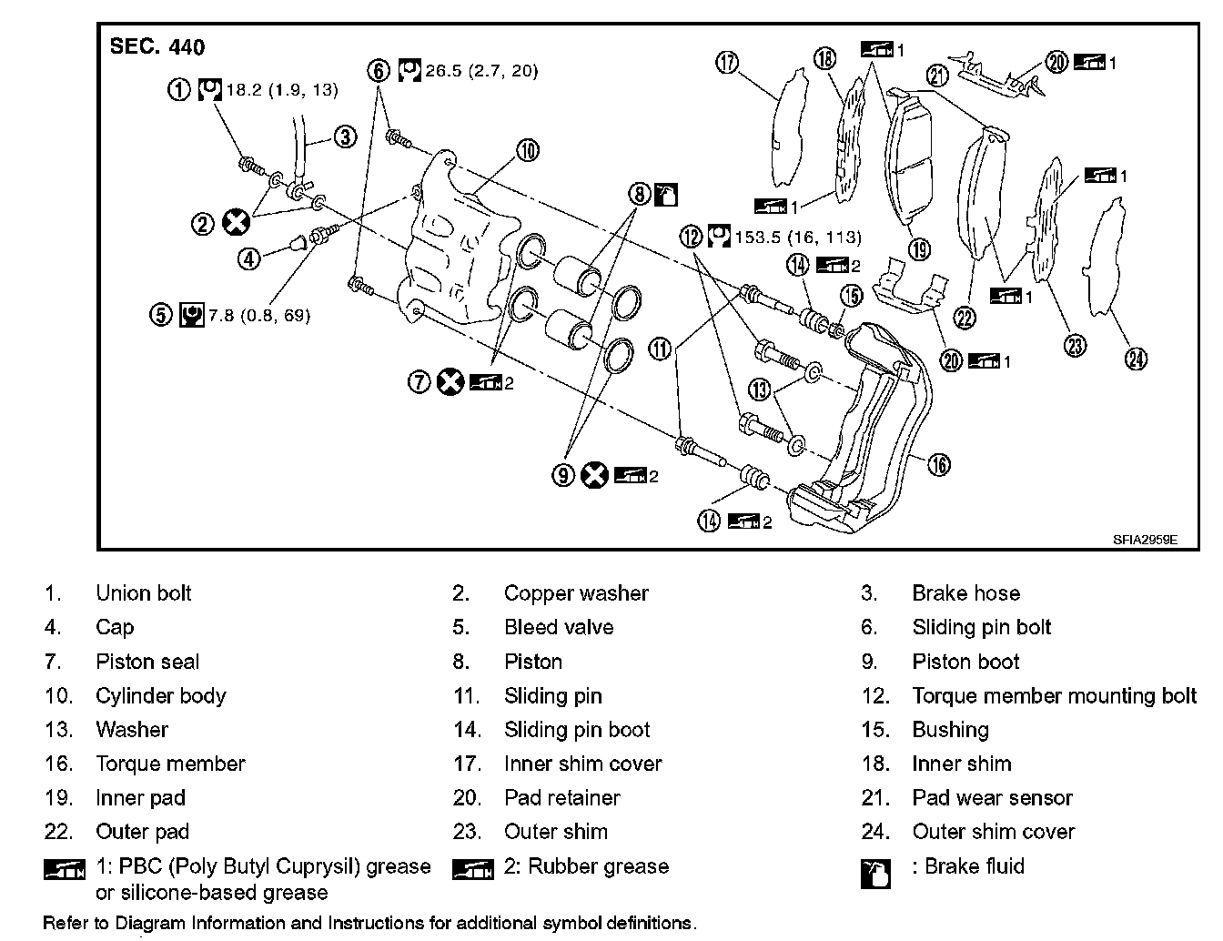 - THE LARGE ILLUSTRATIONS are exploded views (see the following) and contain tightening torques, lubrication points, section number of the PARTS CATALOG (e.g. SEC. 440) and other information necessary to perform repairs.