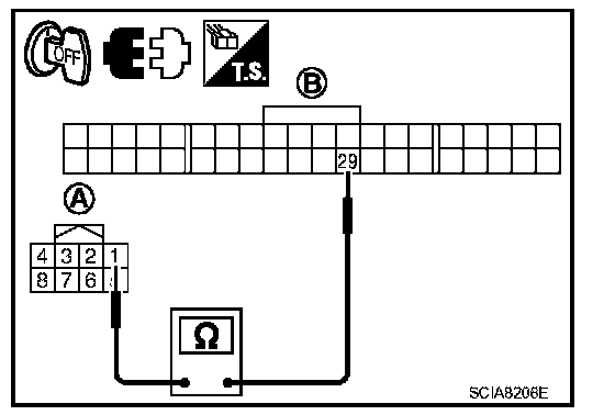 3. Check continuity between CVT device harness connector (A) terminal and combination meter harness connector (B) terminal.