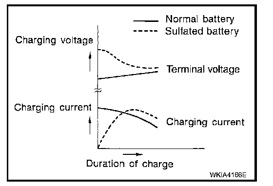 To determine if a battery has been sulfated, note its voltage and current when charging it. Less current and higher voltage are observed in the initial stage of charging sulfated batteries, as shown.