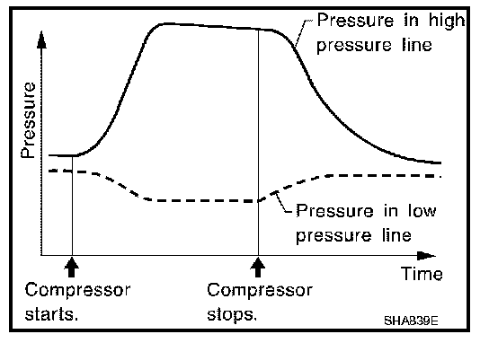 Refrigerant leaks should be checked immediately after stopping the engine. Begin with the leak detector at the compressor. The pressure on the high pressure side will gradually drop after refrigerant circulation stops and pressure on the low pressure side will gradually rise, as shown in the graph. Some leaks are more easily detected when pressure is high.