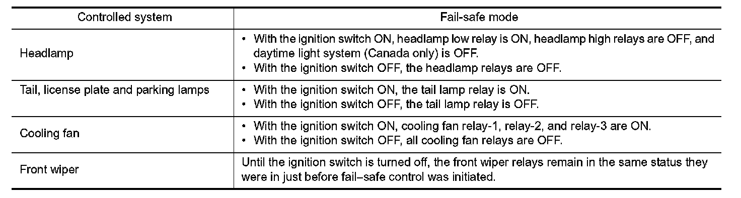 - Operation of control parts by IPDM E/R during fail-safe mode is as follows: