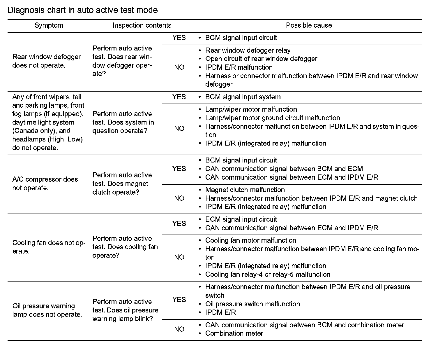 - If any of the systems controlled by IPDM E/R cannot be operated possible cause can be easily diagnosed using auto active test.