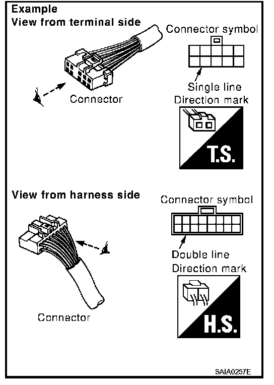 - Connector symbols shown from the harness side are enclosed by a double line and followed by the direction mark.