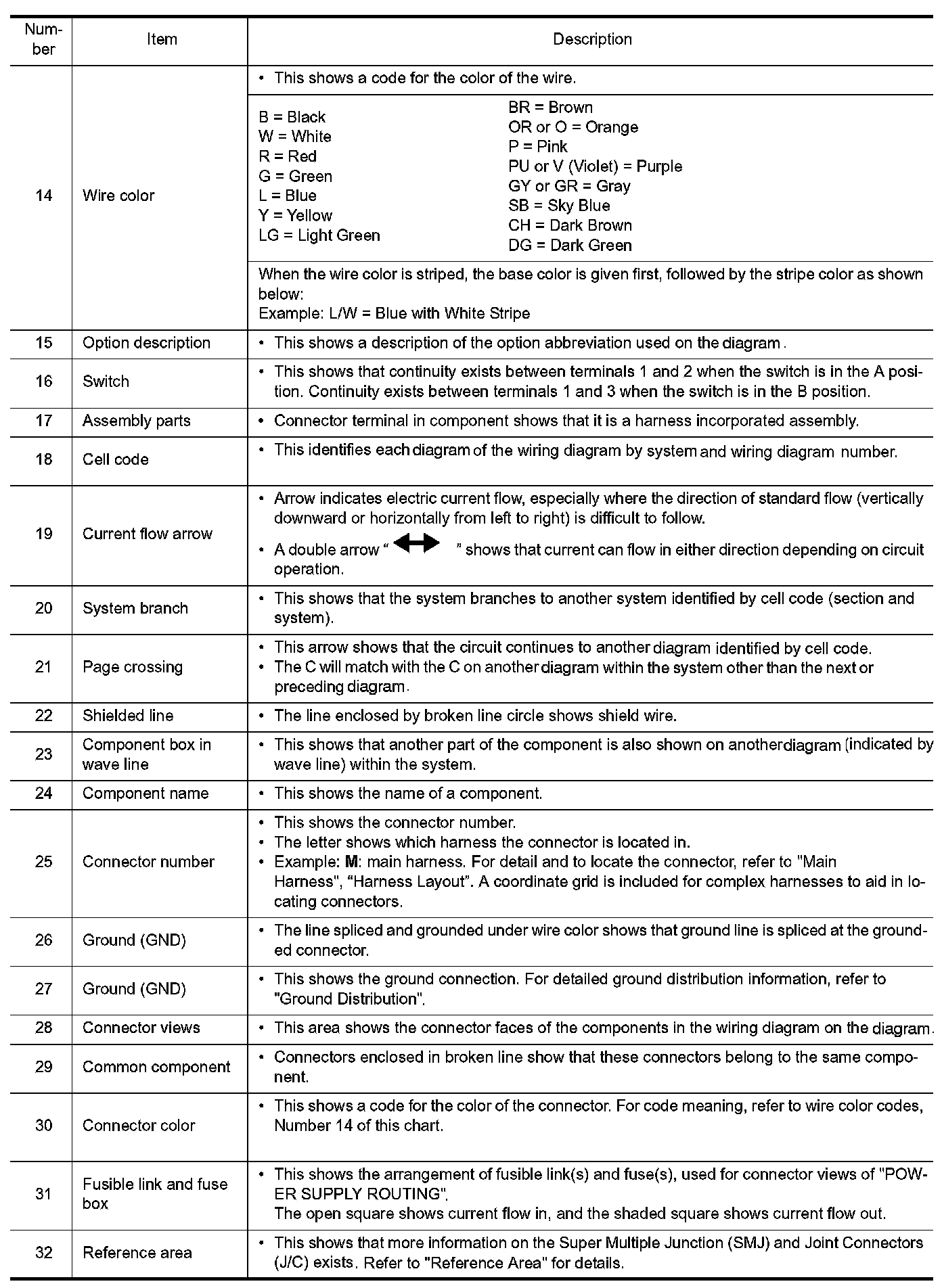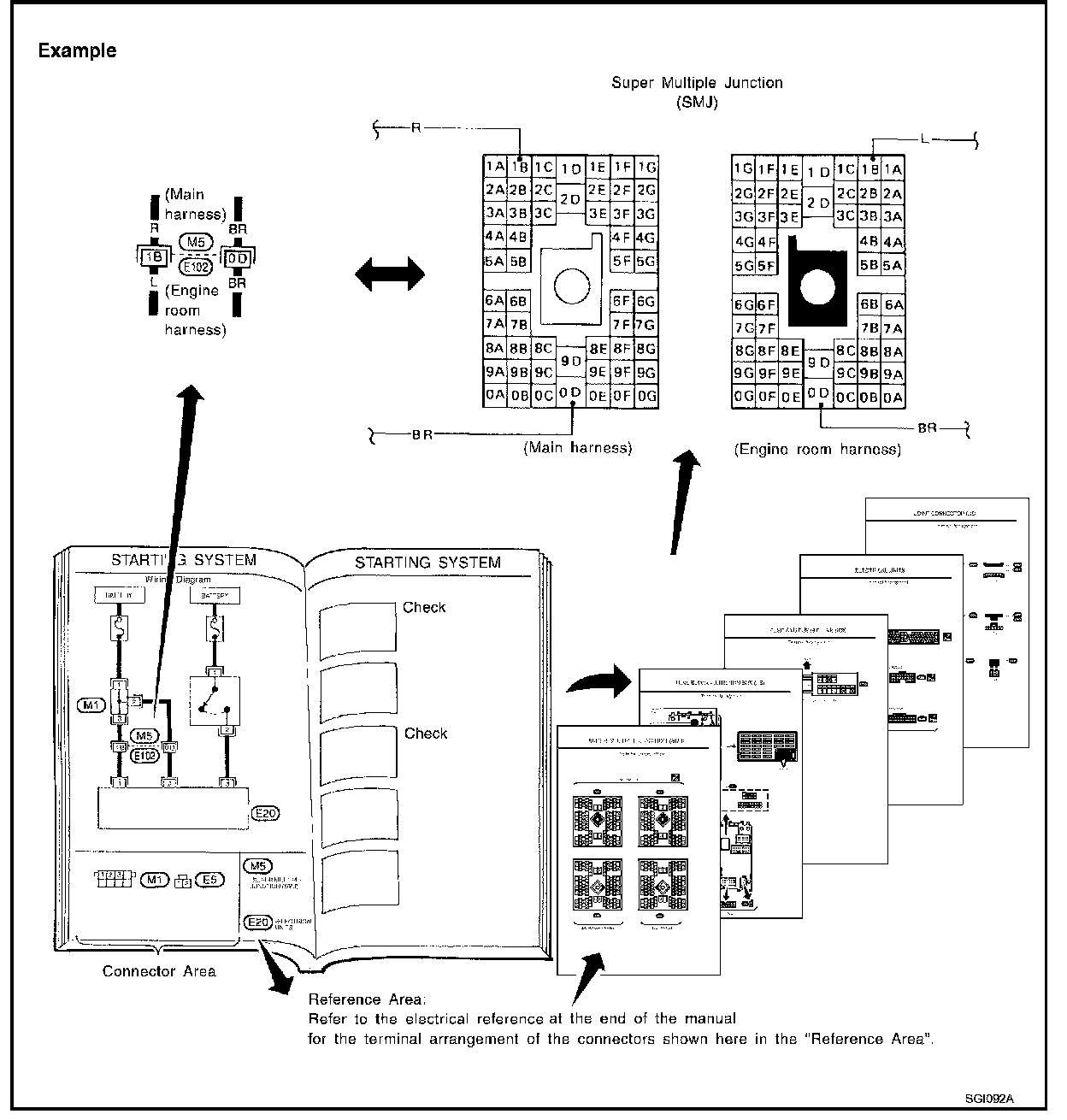 The Reference Area of the wiring diagram contains references to additional electrical reference pages at the end of the manual. If connector numbers and titles are shown in the Reference Area of the wiring diagram, these connector symbols are not shown in the Connector Area.