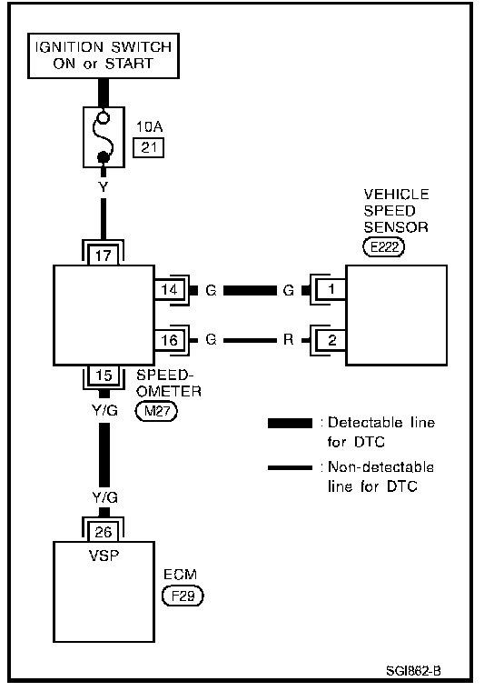 - A line with regular weight (wider line) represents a "detectable line for DTC (Diagnostic Trouble Code)". A "detectable line for DTC" is a circuit in which ECM can detect its malfunctions with the on board diagnostic system.