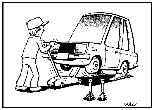 - Before jacking up the vehicle, apply wheel chocks or other tire blocks to the wheels to prevent the vehicle from moving. After jacking up the vehicle, support the vehicle weight with safety stands at the points designated for proper lifting before working on the vehicle.