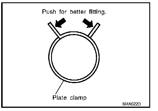 - After installing plate clamps, apply force to them in the direction of the arrow, tightening rubber hose equally all around.