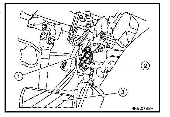 When depress on the brake pedal, ASCD brake switch (1) is turned OFF and stop lamp switch (2) is turned ON. ECM detects the state of the brake pedal (3) by this input of two kinds (ON/OFF signal)