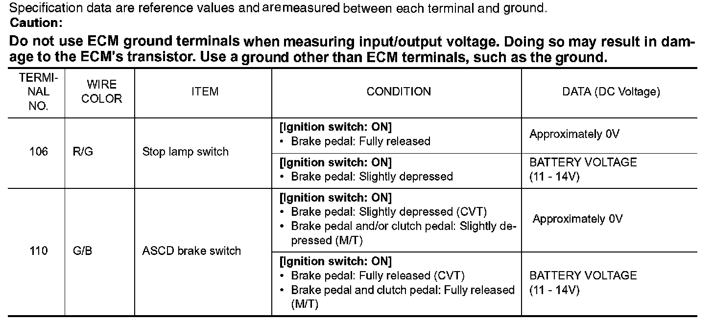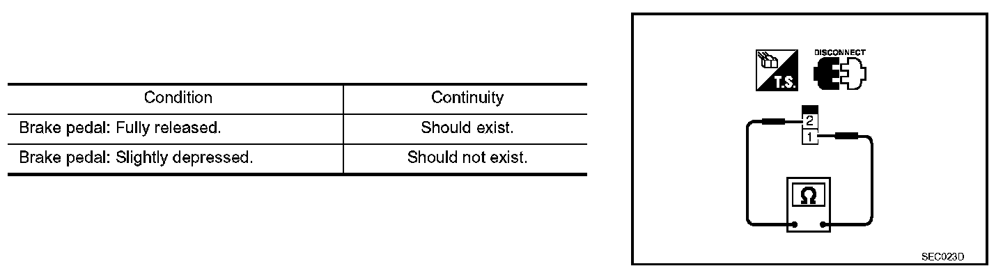 3. Check continuity between ASCD brake switch terminals 1 and 2 under the following conditions.