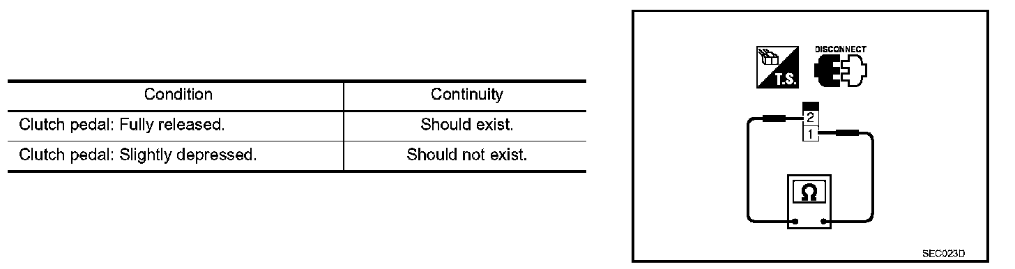 3. Check continuity between ASCD clutch switch terminals 1 and 2 under the following conditions.