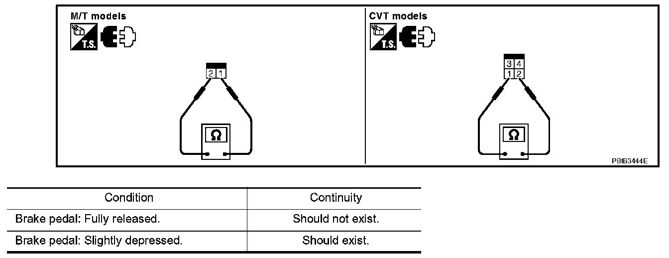 3. Check continuity between stop lamp switch terminals 1 and 2 under the following conditions.