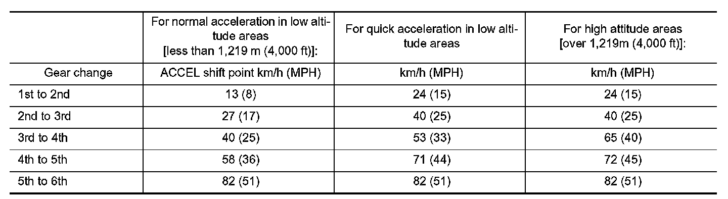 Shown below are suggested vehicle speeds for shifting into a higher gear. These suggestions relate to fuel economy and vehicle performance. Actual upshift speeds will vary according to road conditions, the weather and individual driving habits.