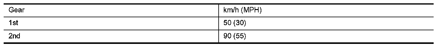 Do not exceed the maximum suggested speed in any gear. For level road driving, use the highest gear suggested for that speed. Always observe posted speed limits and drive according to the road conditions to ensure safe operation. Do not over-rev the engine when shifting to a lower gear as it may cause engine damage or loss of vehicle control.
