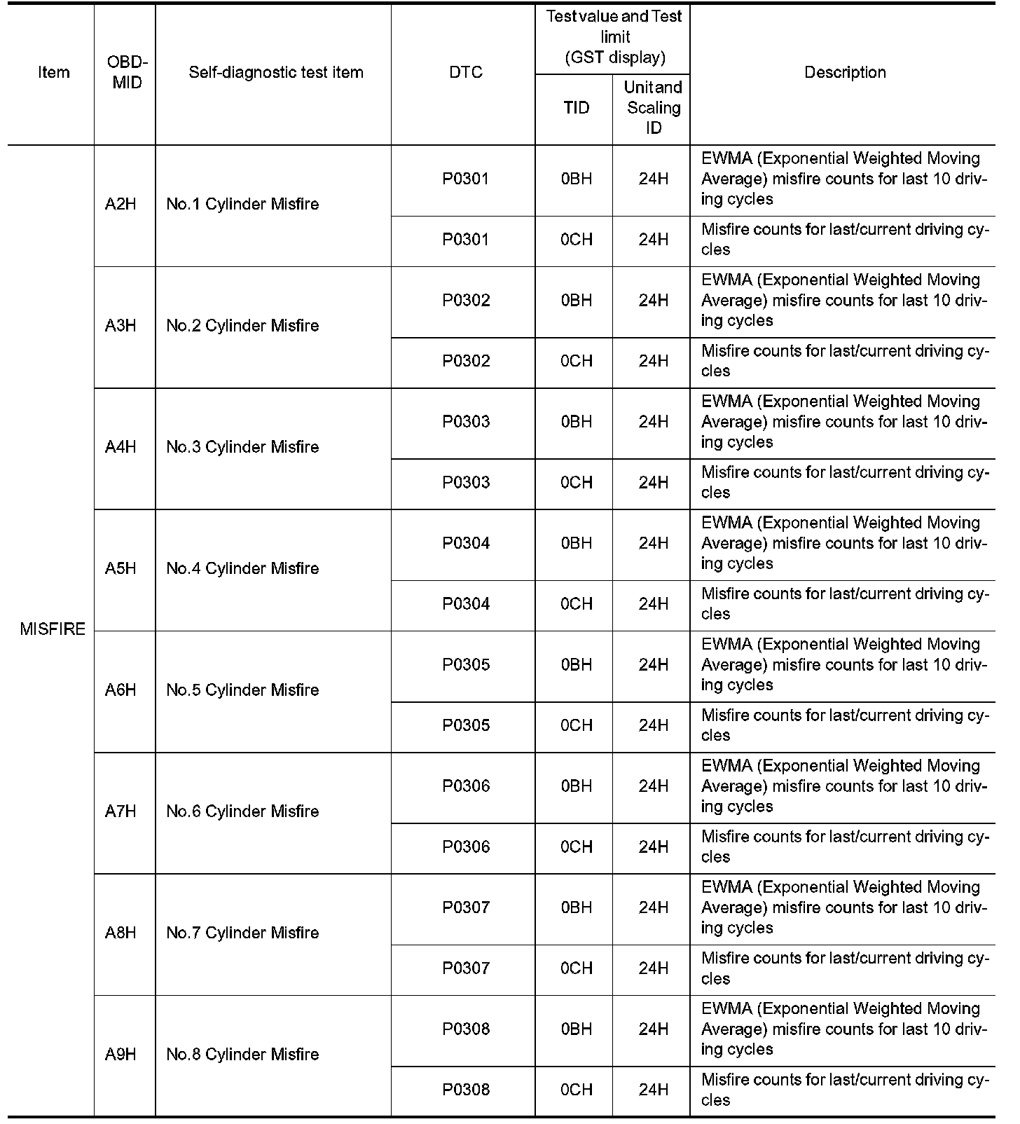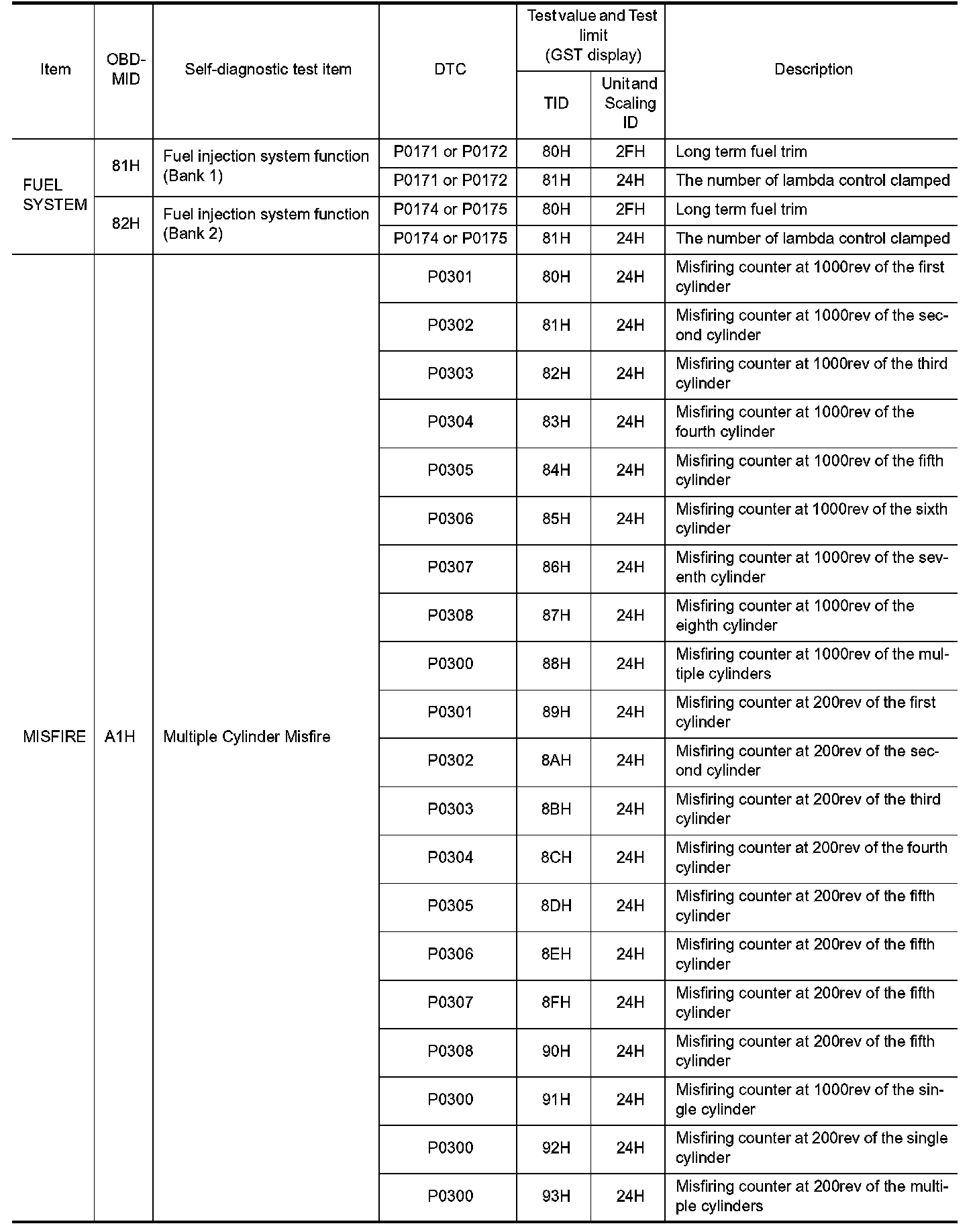 These data (test value and test limit) are specified by On Board Monitor ID(OBDMID), Test ID (TID), Unit and Scaling ID and can be displayed on the GST screen.
