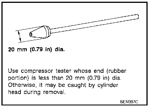 ^ Use compression gauge whose picking up end inserted to spark plug hole is smaller than 20 mm (0.79 in) in diameter. Otherwise, it may be caught by cylinder head during removal.