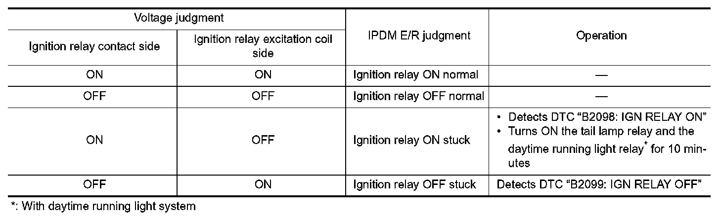 - IPDM E/R judges the ignition relay error if the voltage differs between the contact circuit and the excitation coil circuit.
