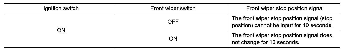 When a front wiper stop position signal is in the conditions listed below, IPDM E/R stops power supply to wiper after repeating a front wiper 10 seconds activation and 20 seconds stop five times.