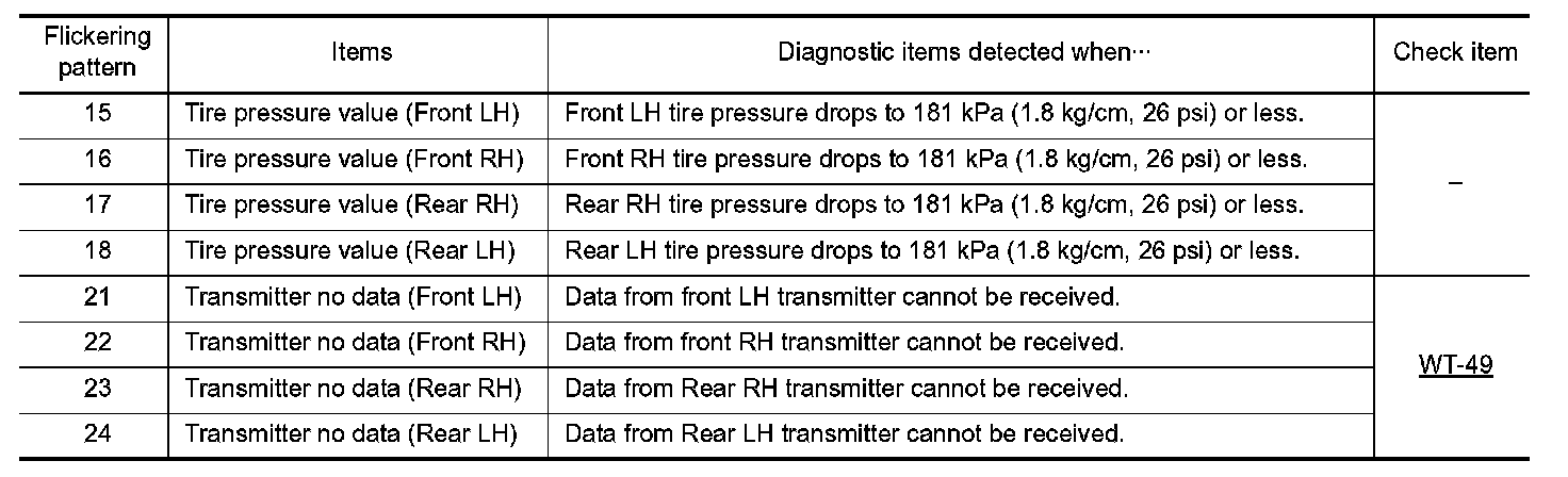 When the TPMS detects low inflation pressure or another unusual symptom, the warning lamps in the combination meter comes on.