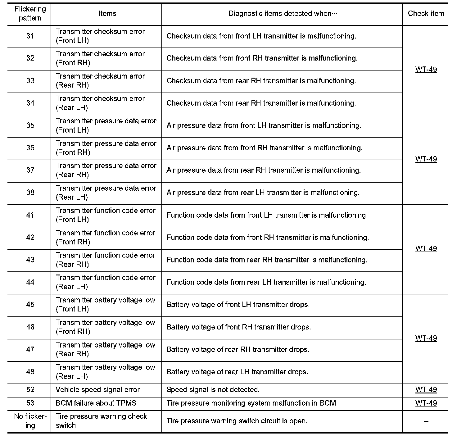 During driving, the TPMS receives the signal transmitted from the transmitter installed in each wheel, when the tire pressure becomes low. The control unit (BCM) of this system has pressure judgment and trouble diagnosis functions.