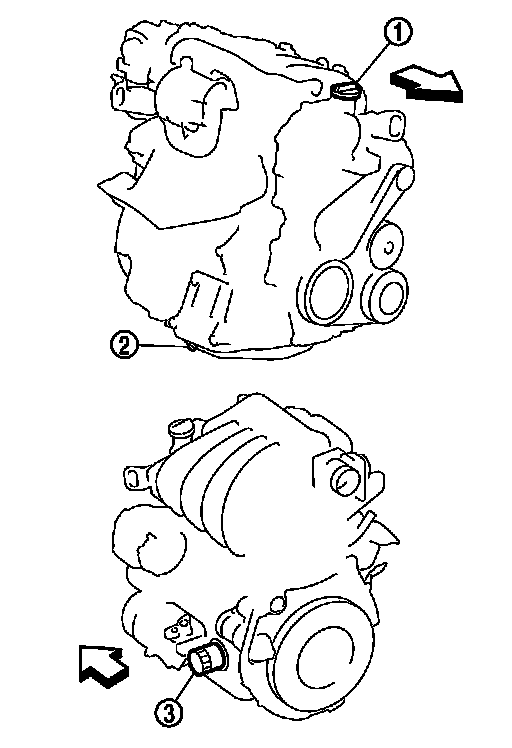 4. Remove oil filler cap (1) and then remove oil pan drain plug (2).