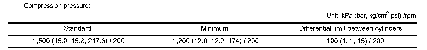 - If compression pressure is below minimum value, check valve clearances and parts associated with combustion chamber (Valve, valve seat, piston, piston ring, cylinder bore, cylinder head, cylinder head gasket). After the checking, measure the compression pressure again.