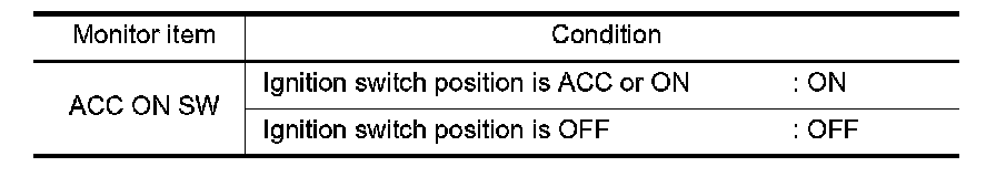 Check ACC switch ("ACC ON SW") in "DATA MONITOR" mode with CONSULT-III.