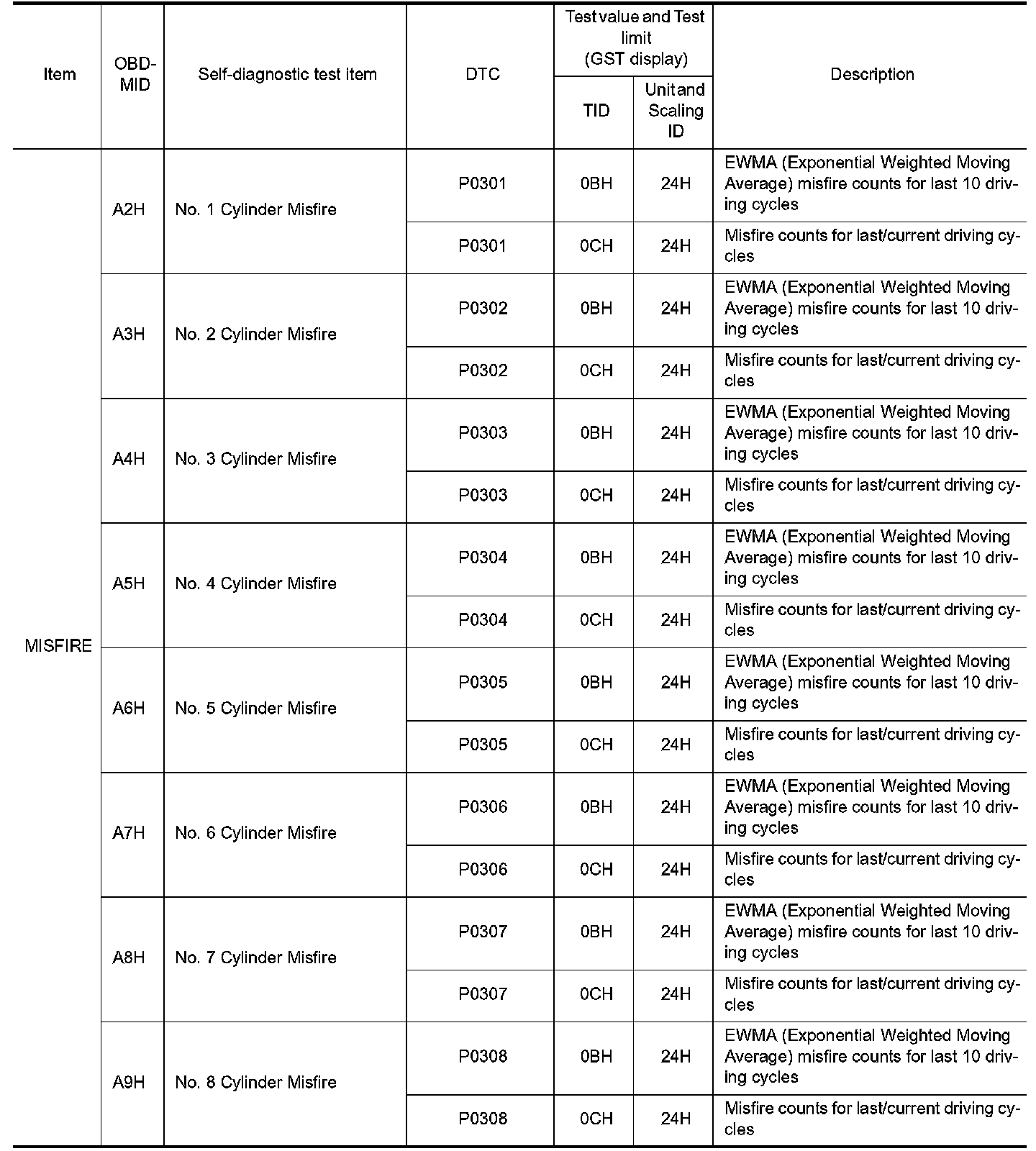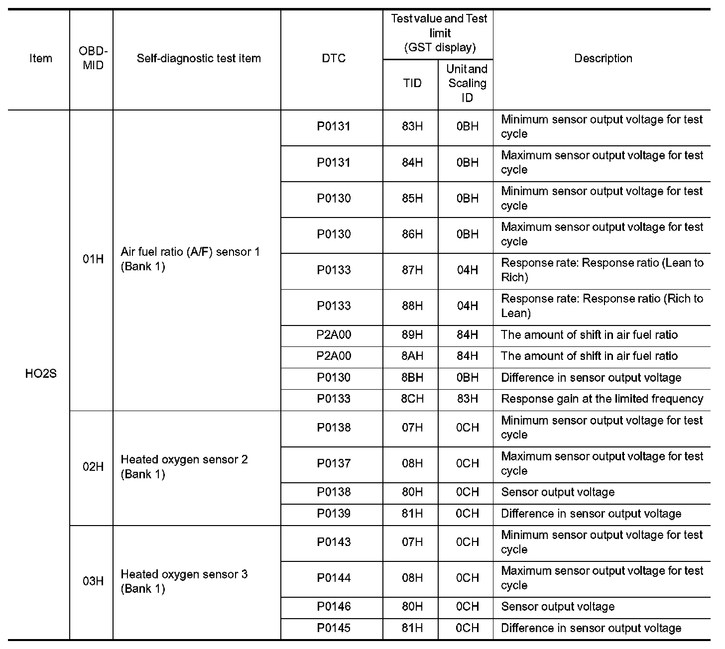 These data (test value and test limit) are specified by On Board Monitor ID(OBDMID), Test ID (TID), Unit and Scaling ID and can be displayed on the GST screen.