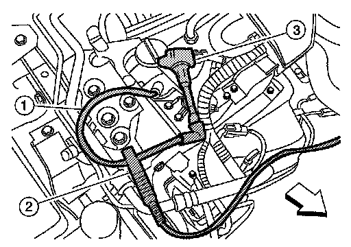2. Connect No. 1 ignition coil (3) and No. 1 spark plug with suitable high-tension wire (1) as shown, and attach timing light (2) clamp to this wire.