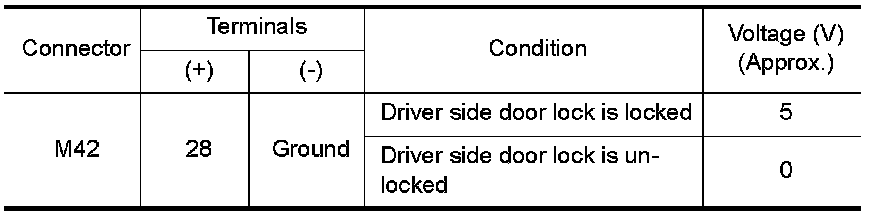 2. Check voltage between Intelligent Key unit harness connector M42 terminal 28 and ground.