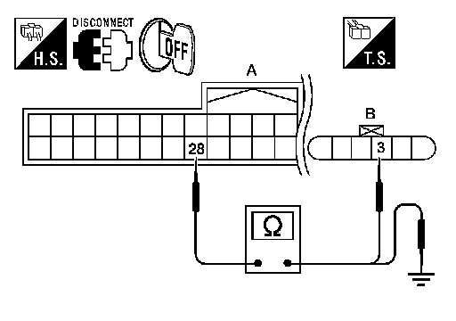 M42 (A) terminal 28 and front door lock assembly LH (door unlock sensor) harness connector D9 (B) terminal 3.
