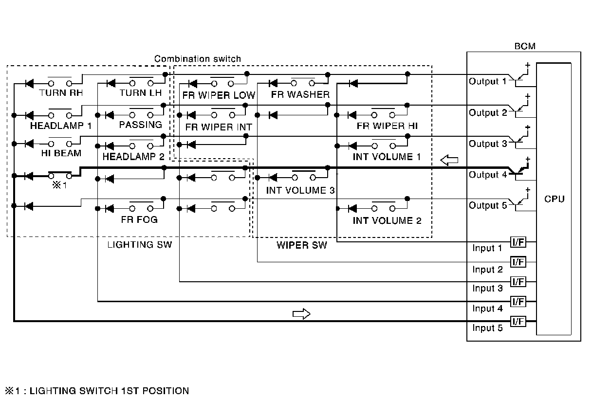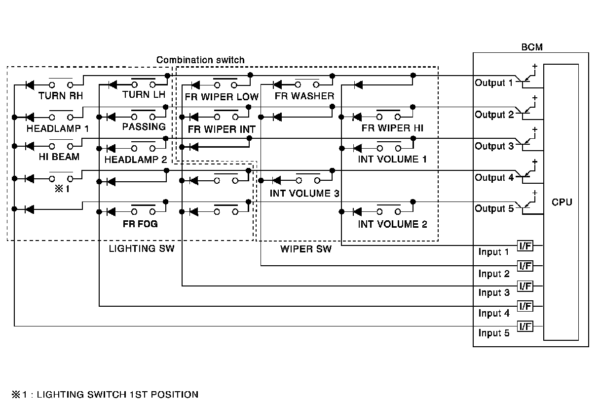 - BCM reads information of a maximum of 20 switches by combining five output terminals (OUTPUT 1-5) and five input terminals (INPUT 1-5).