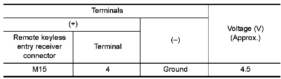 2. Check voltage between remote keyless entry receiver connector M15 terminal 4 and ground.