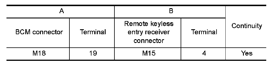 2. Check continuity between BCM connector M18 (A) terminal 19 and remote keyless entry receiver connector M15 (B) terminal 4.