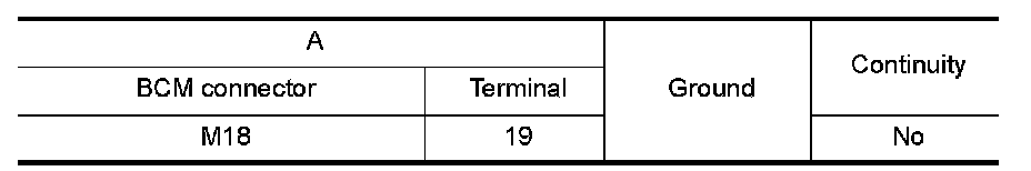 3. Check continuity between BCM connector (A) M18 terminal 19 and ground.