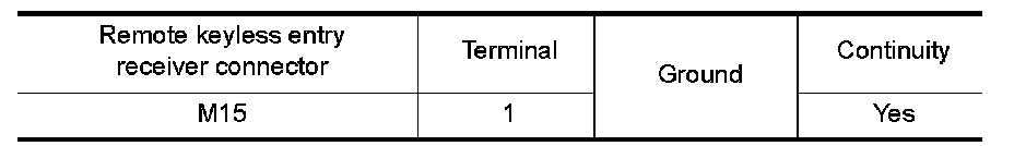 Check continuity between remote keyless entry receiver connector M15 terminal 1 and ground.