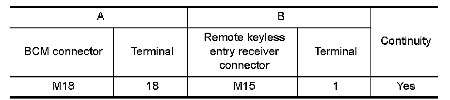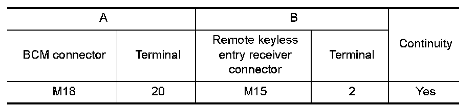 1. Check continuity between BCM connector M18 (A) terminal 20 and remote keyless entry receiver connector M15 (B) terminal 2.