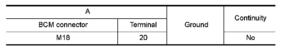 2. Check continuity between BCM connector (A) M18 terminal 20 and ground.